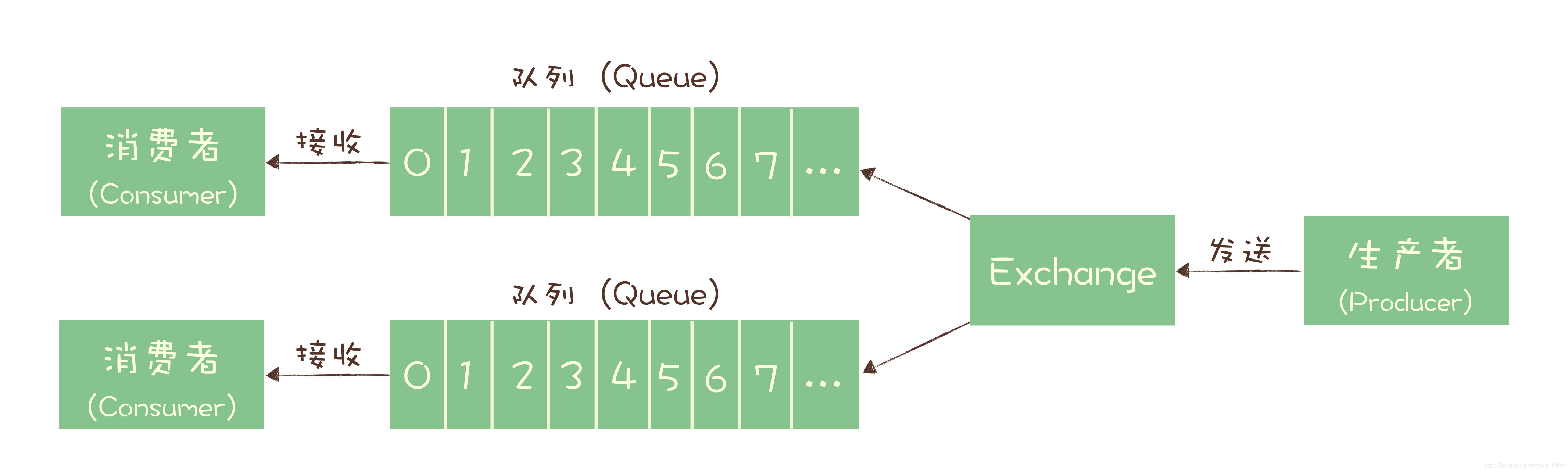 如果有多个生产者往同一个队列里面发送消息,这个队列中可以消费到的消息,就是这些生产者生产的所有消息的合集。消息的顺序就是这些生产者发送消息的自然顺序。如果有多个消费者接收同一个队列的消息,这些消费者之间实际上是竞争的关系,每个消费者只能收到队列中的一部分消息,也就是说任何一条消息只能被其中的一个消费者收到。