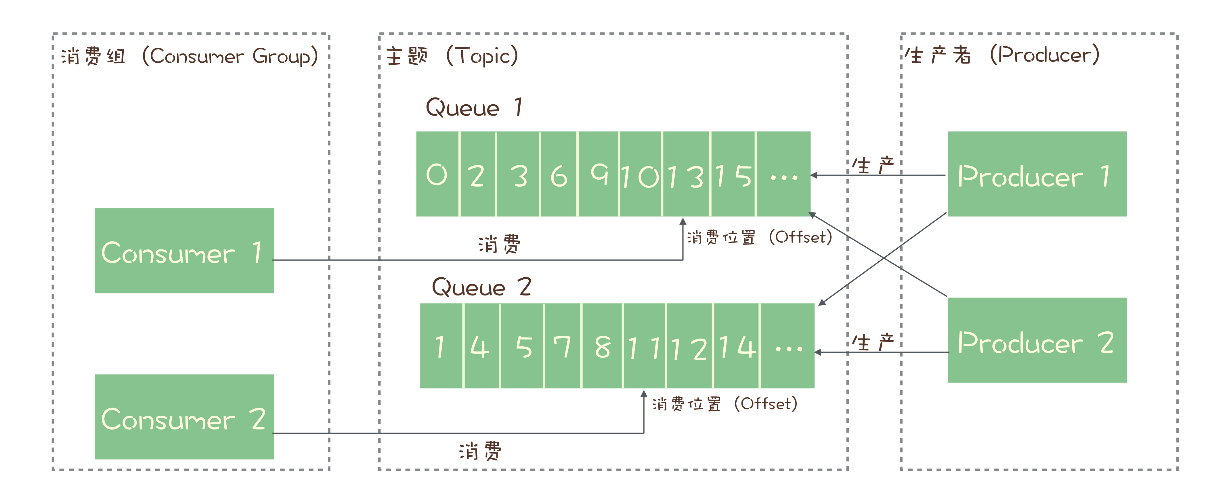 我们再来看看另一种常见的消息队列 Kafka,Kafka 的消息模型和 RocketMQ 是完全一样的,我刚刚讲的所有 RocketMQ 中对应的概念,和生产消费过程中的确认机制,都完全适用于 Kafka。唯一的区别是,在 Kafka 中,队列这个概念的名称不一样,Kafka 中对应的名称是“分区(Partition)”,含义和功能是没有任何区别的。