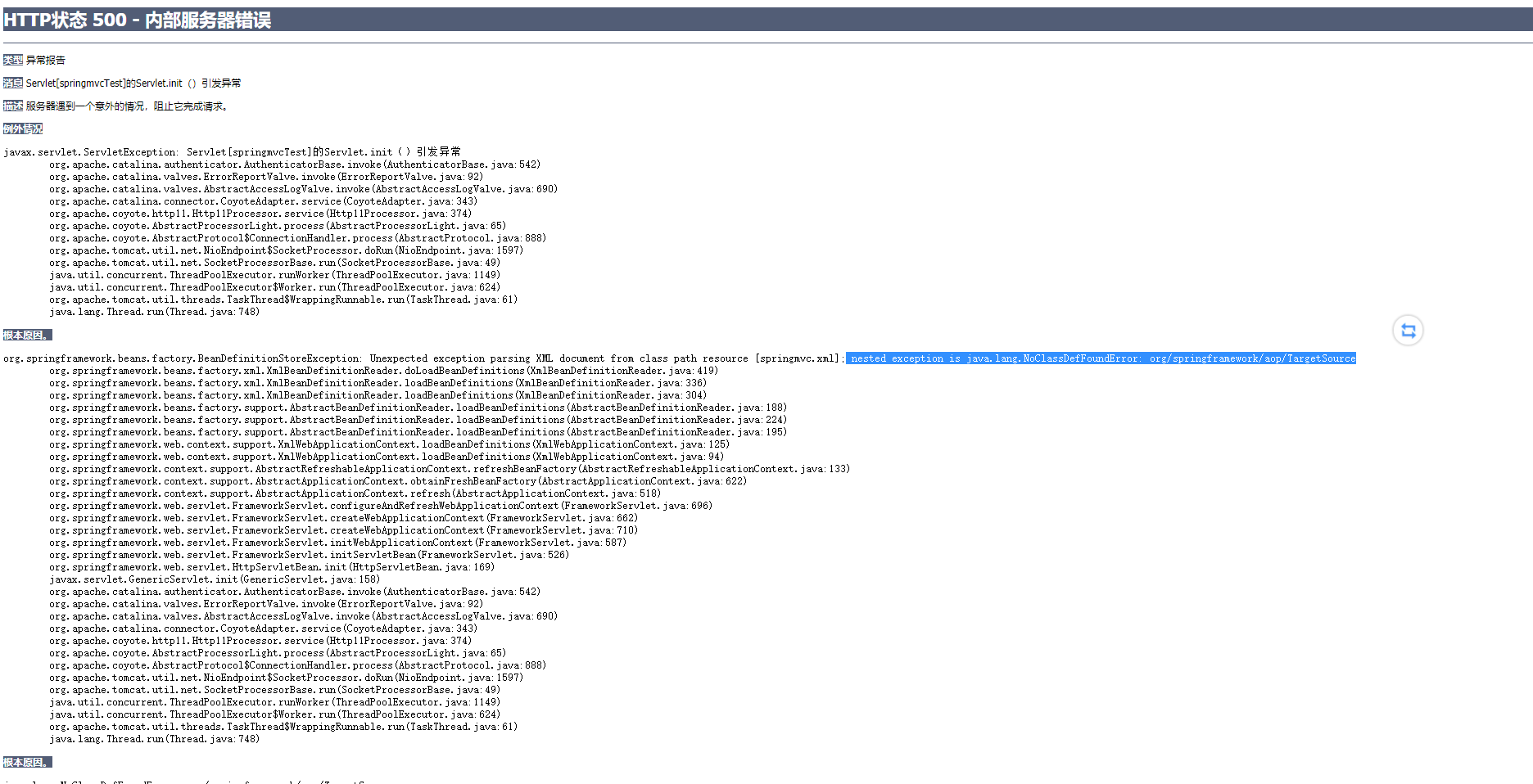 nested exception is java.lang.NoClassDefFoundError: org/springframework/aop/TargetSource错误样式:解决方案(很简单的错误):加上对应版本的 spring-aop-*.jar 包加上去后别忘了看看Idea Tomcat服务器的工件加上去没,没有的话会报相似的错误,比如:修正工件请点击版权声明:本文为NeiHan2020原创文章,遵循CC 4.0 BY-SA版权协议,转载请附上原文出处链接和本声明。原文链接:https://blog.csdn.net/NeiHan2020/article/details/118254257