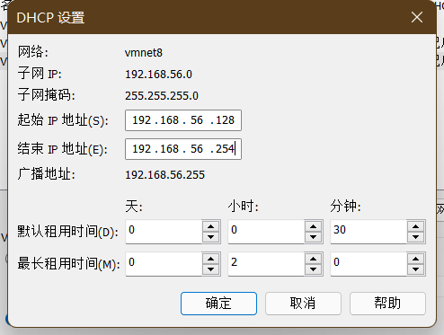 注意:如果这个位置是灰色的,说明没有管理员权限,先点击旁边的更改配置或者以管理员身份重启VMware再进行操作 - 打开DHCP设置,填入一个合理的ip范围,点确定