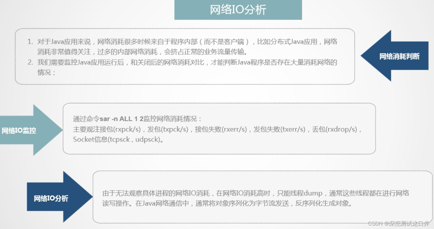 jstack -l 进程id|grep "java.lang.Thread.State”|awk '{print $2$3$4$5}’ | sort |uniq -c. #统计不同状态的线程数量4、网络Io分析