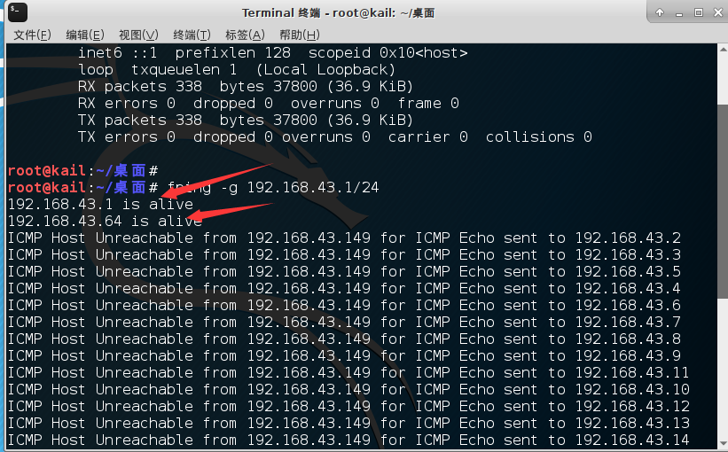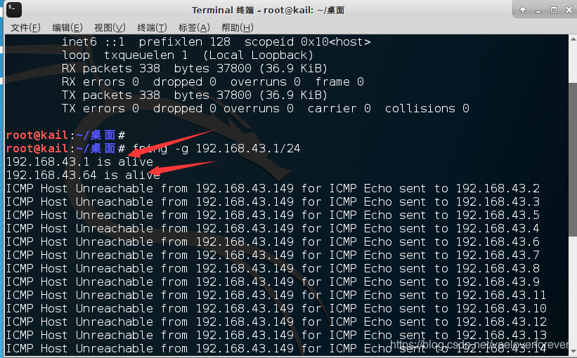 Step 2.在虚拟机中,通过fping命令,查看当前局域网还存在那些主机,以确定要攻击的主机的ip地址
