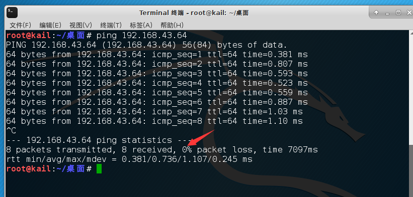 从图中可以看出,没有包丢失,两台主机可以通信。可以进行ARP攻击。