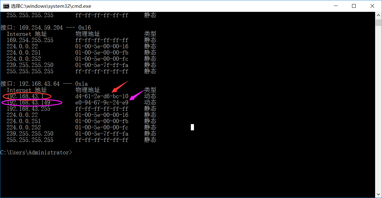 上图中,第一个ip地址192.168.43.1即为当前局域网的网关,而第二个ip地址就是要攻击的物理机的ip地址:192.168.43.64