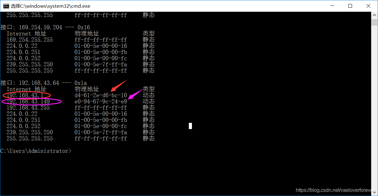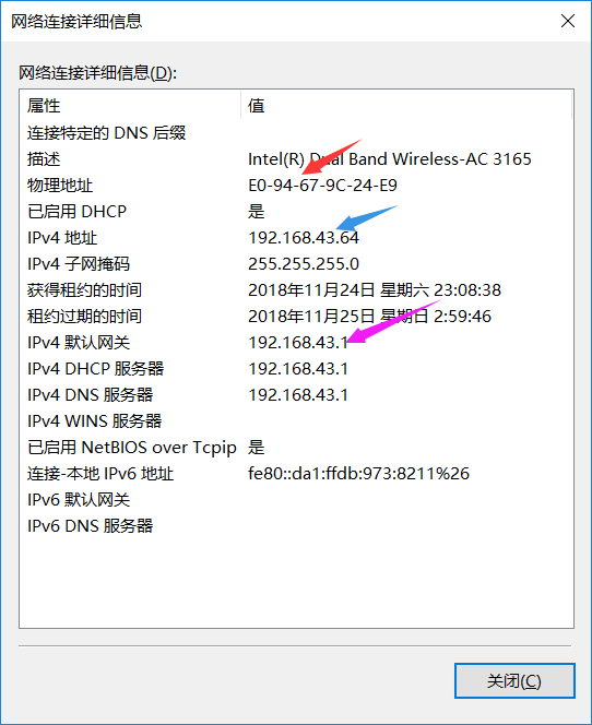 从右图中可以看出,物理机的ip地址的确为192.168.43.64(蓝色箭头),其MAC地址为E0-94-67-9C-24-E9(红色箭头),而局域网的网关地址也确实为192.168.43.1