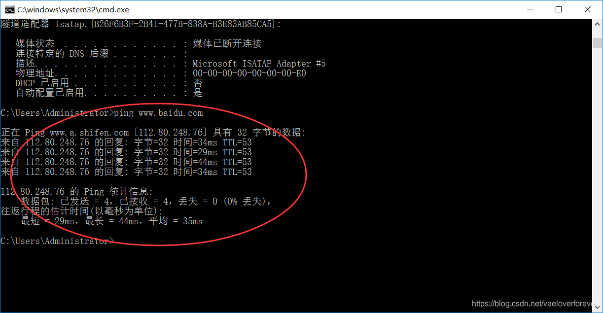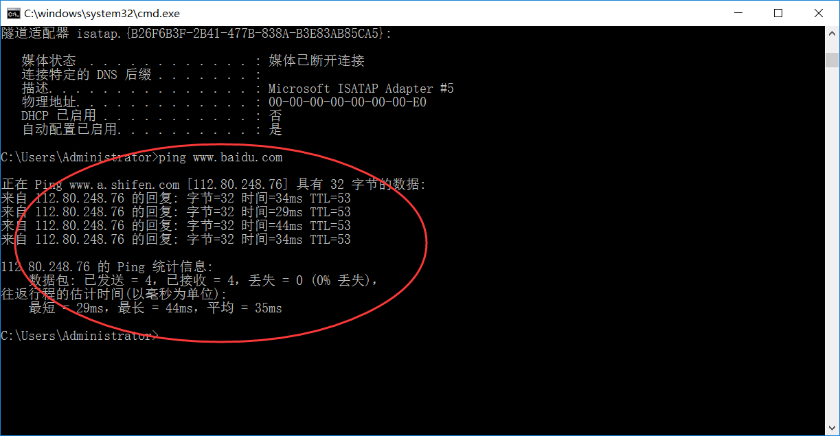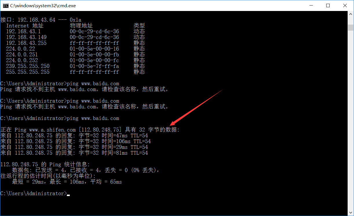 Step 6.在攻击之前,检测一下被攻击主机的联网状态,用被攻击主机的cmd,ping一下百度。