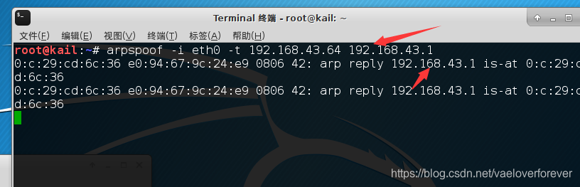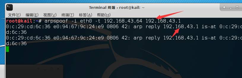 输入arpspoof -i eth0 -t 192.168.43.64 192.168.43.1。其中,-i后面的参数是网卡名称,-t后面的参数是目的主机和网关,要截获目的主机发往网关的数据包。