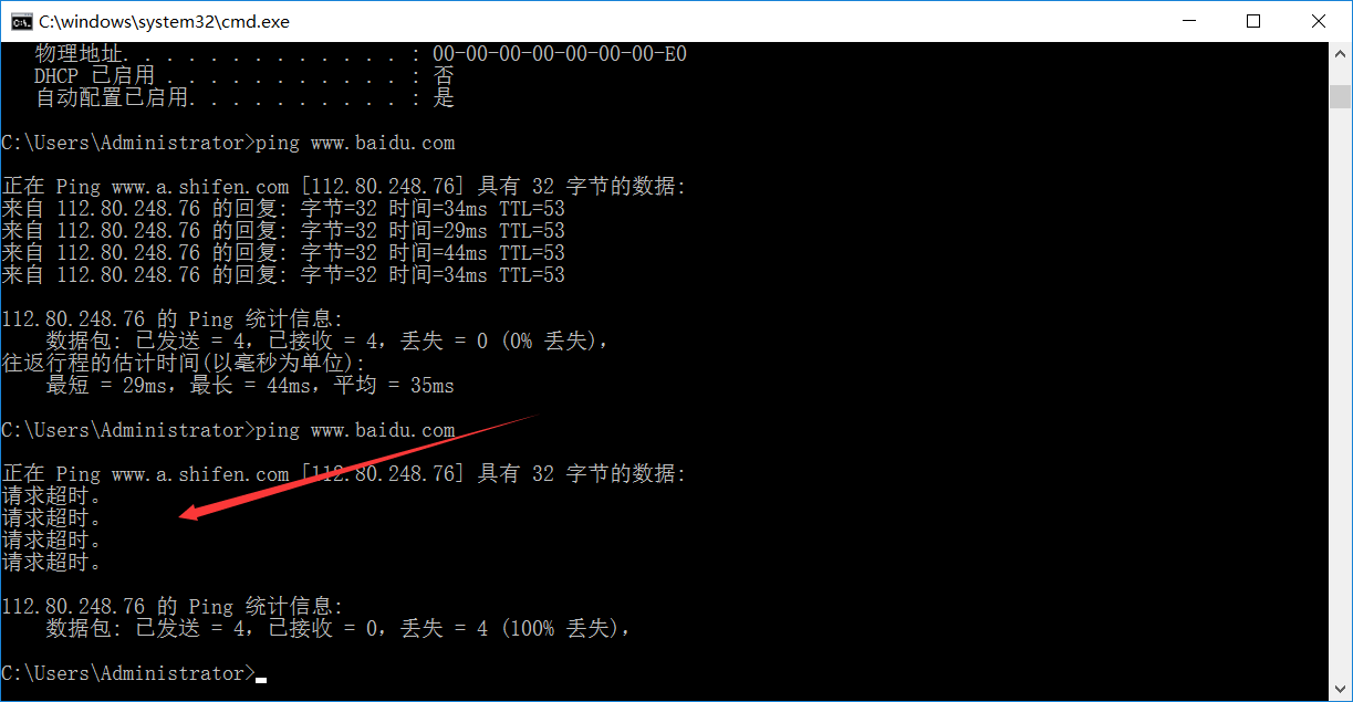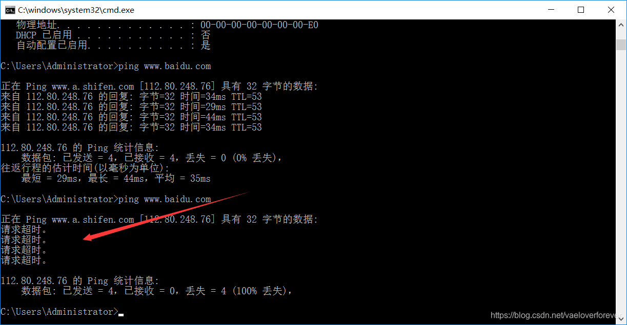 没有包丢失,可以ping通,物理机依旧可以正常上网。