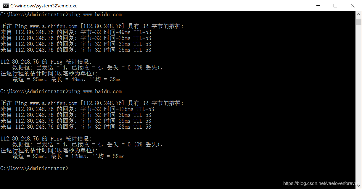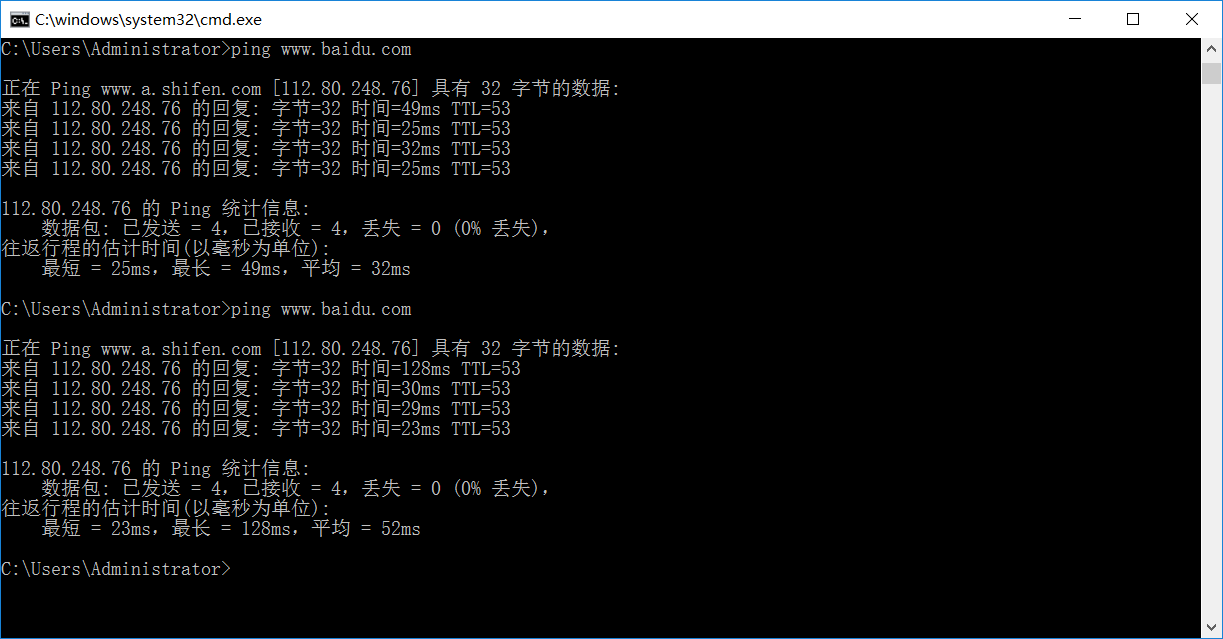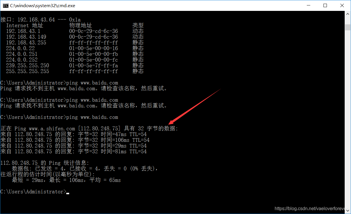 Step 8.在物理机中再次使用cmd,向百度发送一个ping包,检查是否可以联网。