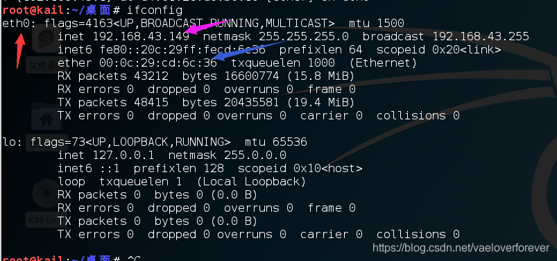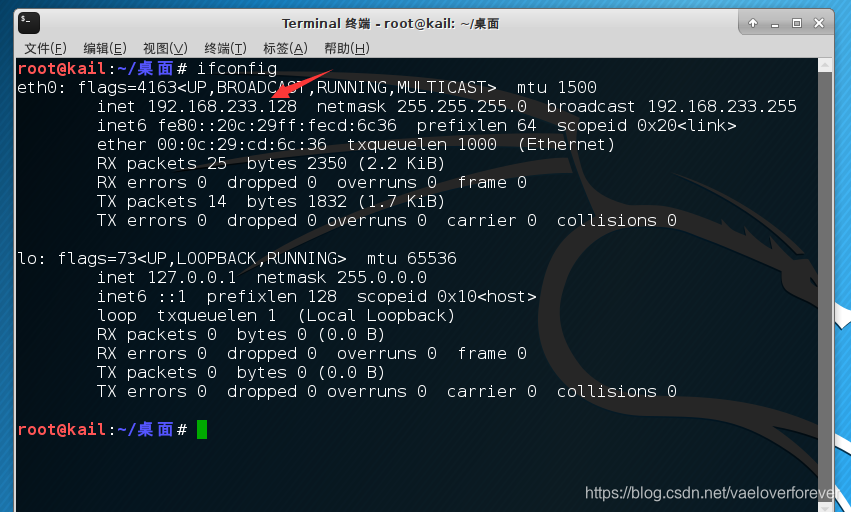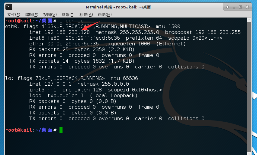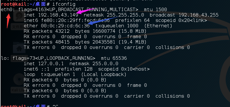 Step 1. 在攻击主机打开终端,输入ifconfig,查看其网卡名称、ip地址、MAC地址。