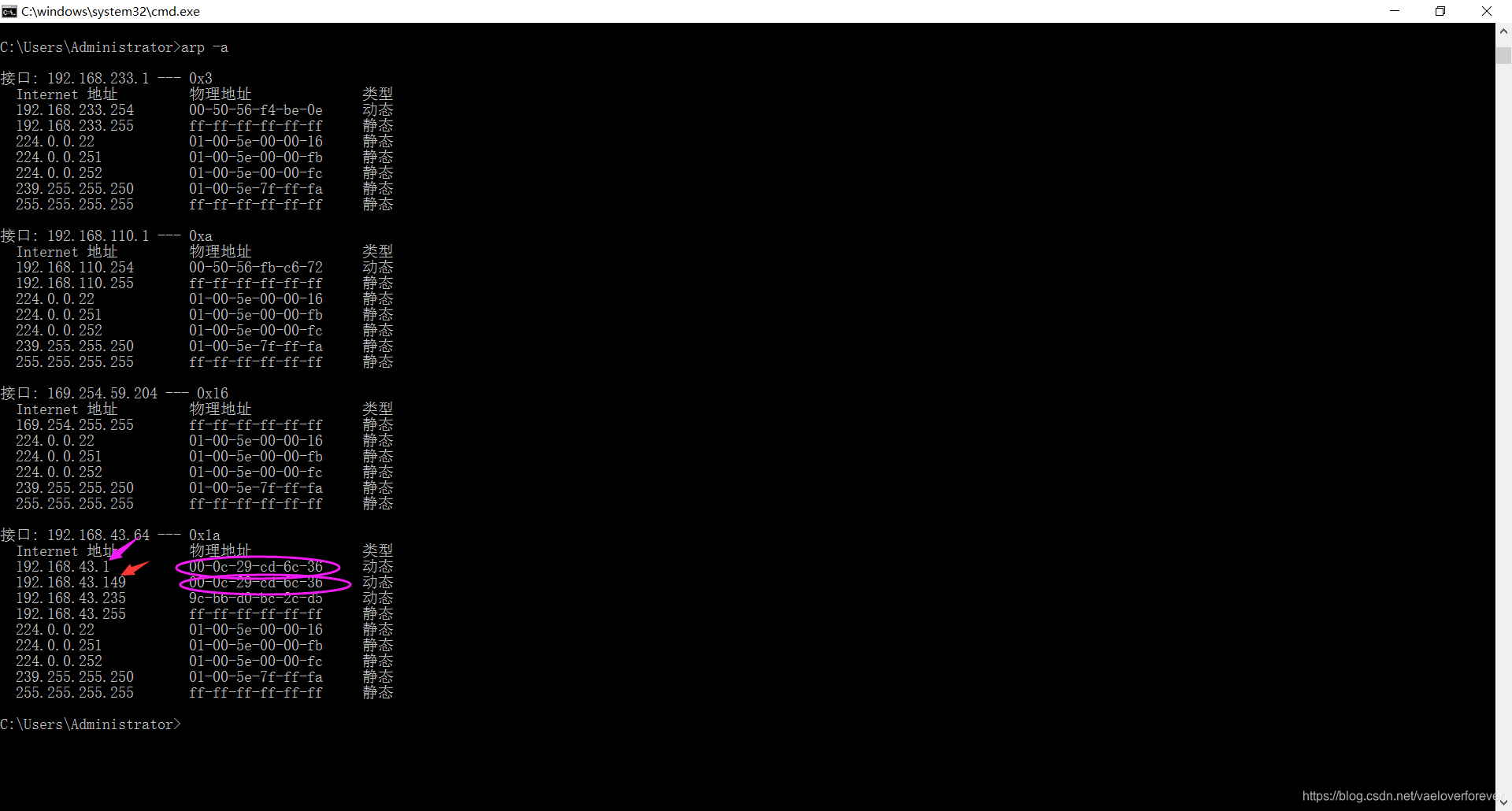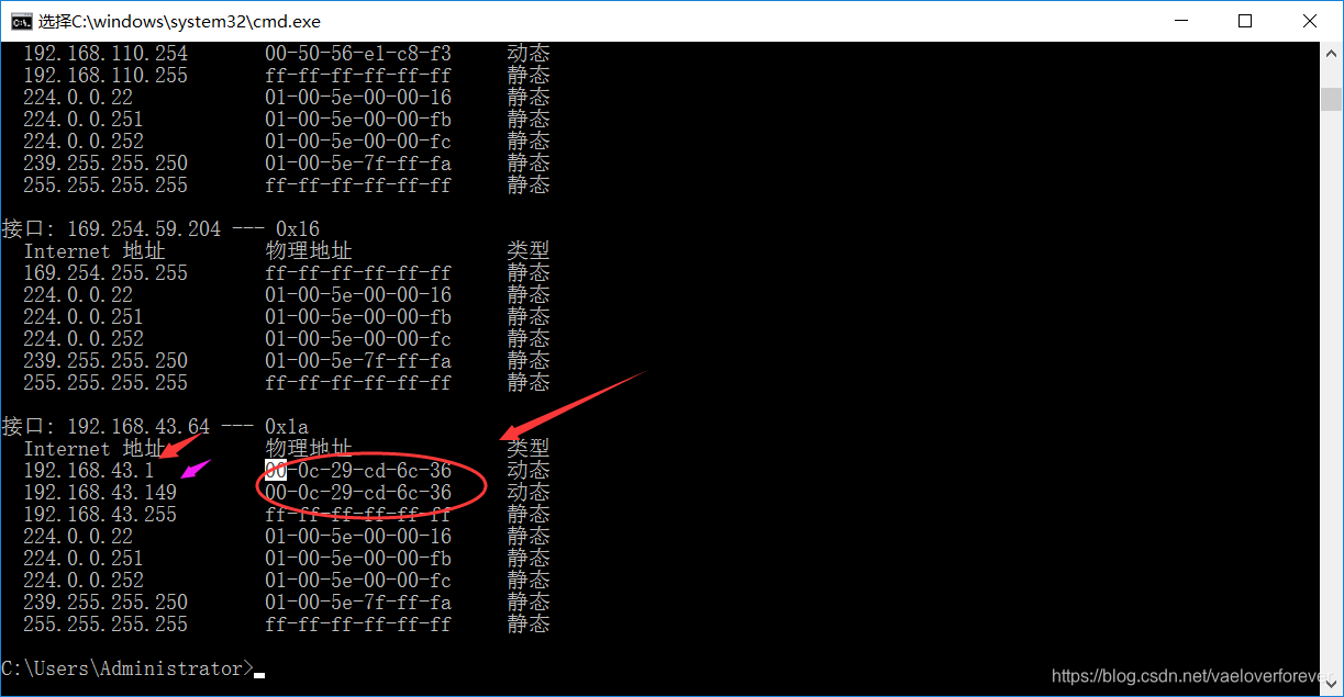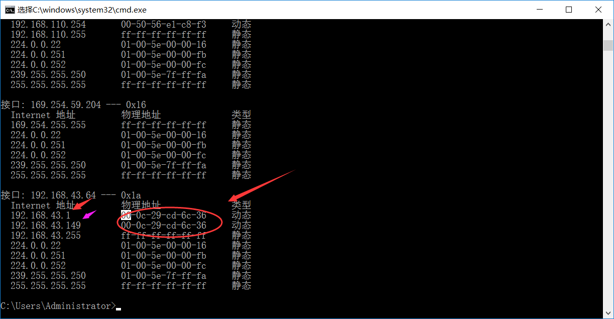 图中显示,物理机中的ARP缓存表记录了网关的MAC地址和攻击主机的MAC地址,可以看出它们的MAC地址是不一样的。