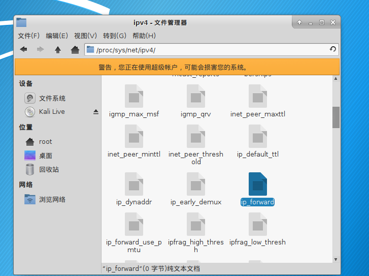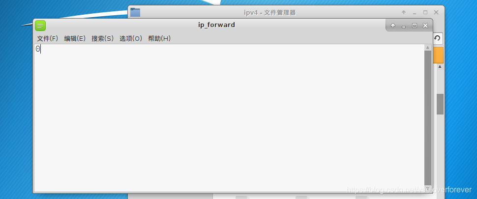 图中是直接找到ip_forward文件,将其值修改为1的。当然也可以通过命令行echo 1 > /proc/sys/net/ipv4/ip_forward实现。