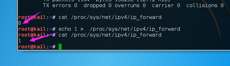 Step 6.在进行ARP欺骗前,得先打开攻击主机的IP转发功能,linux因为系统安全考虑,是不支持IP转发的,其配置文件写在/proc/sys/net/ipv4的ip_forward中。默认为0,接下来修改为1。