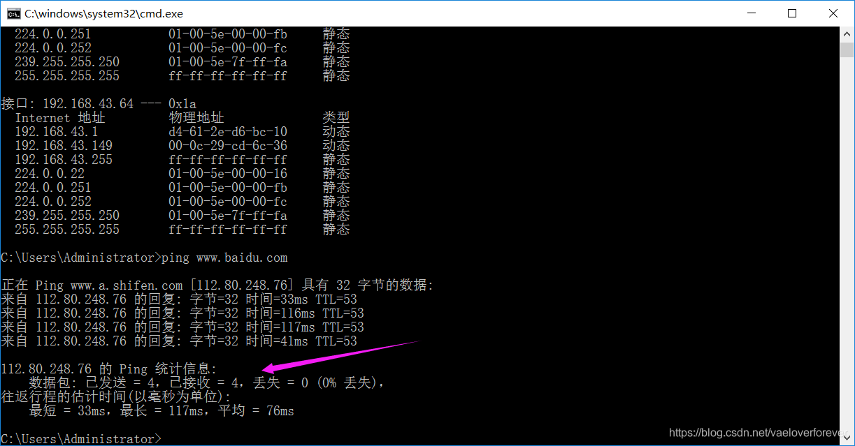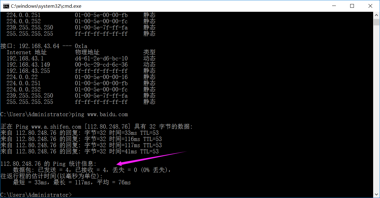 Step 7.在进行ARP欺骗前,先检查物理机的联网状态,Ping一下百度。