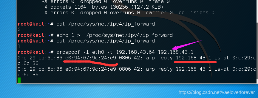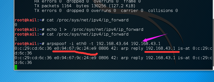 Step 8.在kali linux中利用arpspoof工具,对物理机发起AR欺骗攻击。