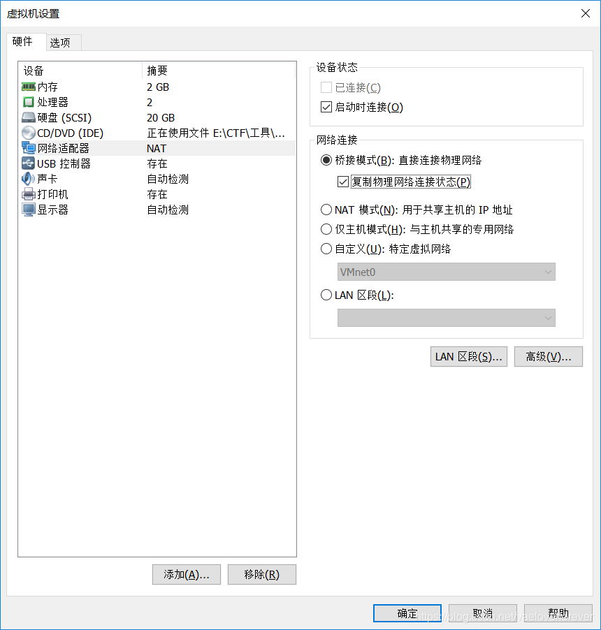 解决方法:通过查阅资料,发现虚拟机的网络连接有三种模式:桥接模式、NAT模式、仅主机模式。一开始我们的虚拟机采用了默认的NAT模式,这种模式下虚拟机共享主机的IP地址,Vmware会在主机上创建专用的虚拟网络,用于主机和虚拟机之间进行通信。而在桥接模式下,虚拟机被当做一个完全独立的主机,占用局域网的一个IP地址,将虚拟机的网卡交接到主机的物理网卡上,通过主机的网卡访问外部的Internet。所以我们应该选择桥接模式。