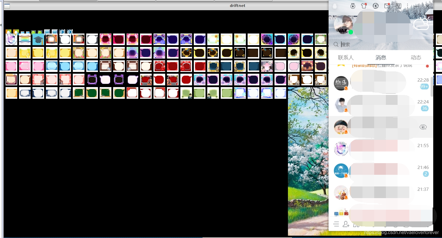 而虚拟机中driftnet窗口右下角可以看到这张图片,另外窗口中的其他图片是物理机登陆的QQ中的图片,第一行的前三个是群头像,其他的是QQ聊天的气泡图片,可以判断,此时这三个群有消息发送到物理机,而且这些消息使用了窗口显示的气泡。