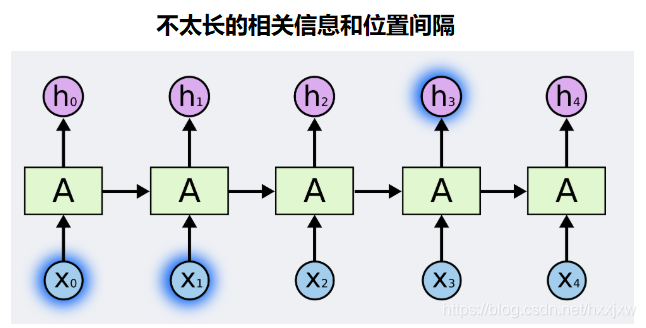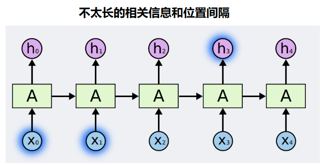 有时候,我们仅仅需要知道先前的信息来执行当前的任务。例如,我们有一个语言模型用来基于先前的词来预测下一个词。如果我们试着预测 “the clouds are in the sky” 最后的词,我们并不需要任何其他的上下文 —— 因此下一个词很显然就应该是 sky。在这样的场景中,相关的信息和预测的词位置之间的间隔是非常小的,RNN 可以学会使用先前的信息。