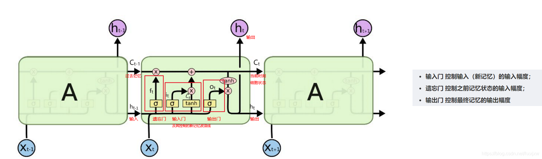 LSTM的遗忘、输入、输出三个门,用于保护和控制细胞的状态。
