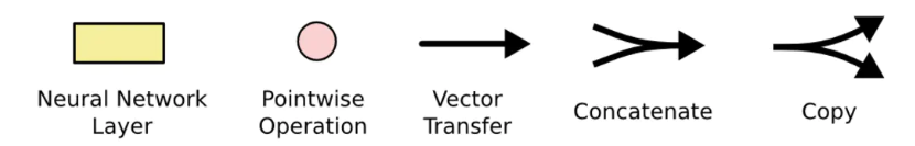 LSTM结构图中每一行都带有一个向量,该向量从一个节点输出到其他节点的输入。 粉红色圆圈表示点向运算,如向量加法、点乘,而黄色框是学习神经网络层。 线的合并表示连接,而线的交叉表示其内容正在复制,副本将转到不同的位置。