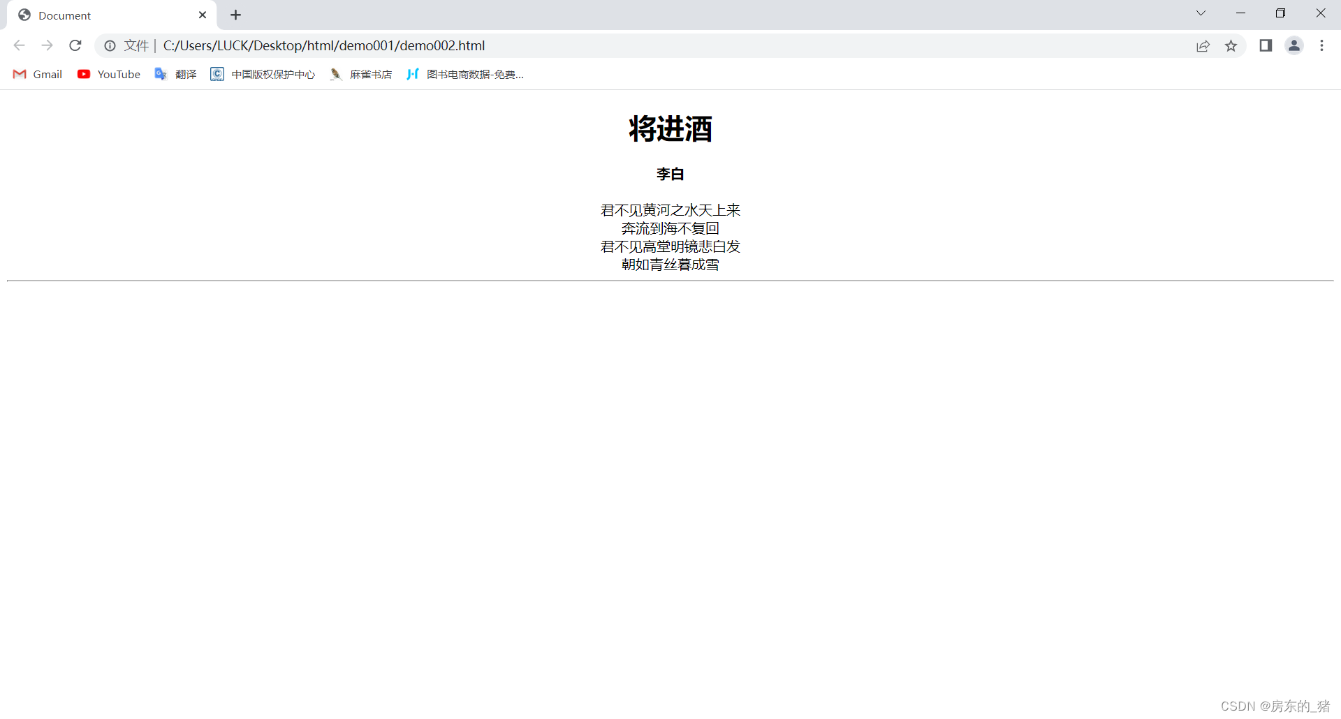 水平分割线线:<hr 属性=“属性值”> 自结束标签