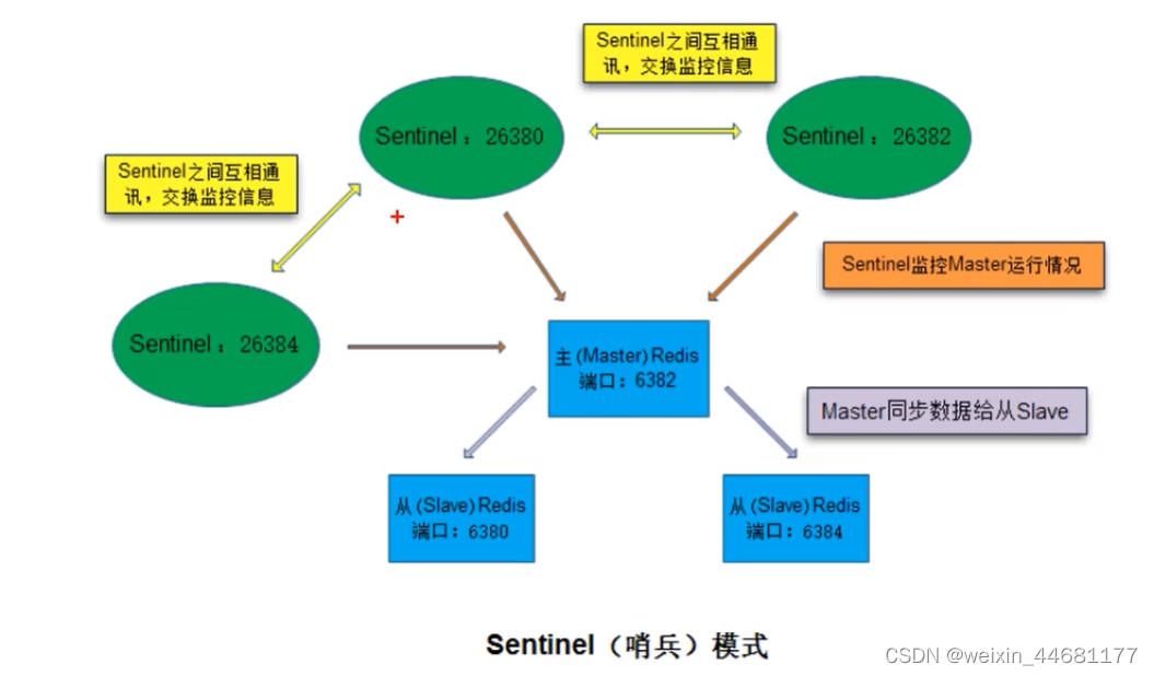redis sentinel 是官方提供的高可用方案,用来监控多个redis服务实例的运行情况。哨兵不处理数据,是监控主redis运行的程序 默认端口号 26379