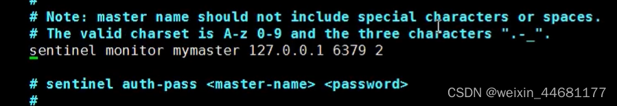 2. 监控redis运行用到的, 分别是 哨兵 监控 主reids名字(随便) 主redis的ip 主redis的port 投票的数量(2) ,达到2个就认为主redis已经不能提供服务了