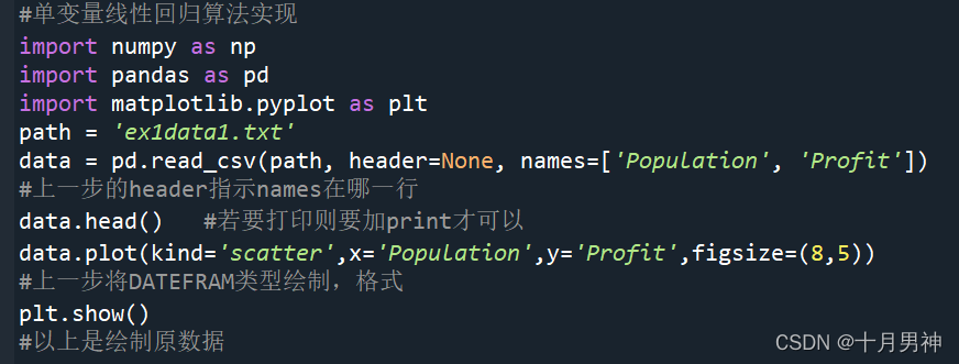 pandas读取CSV文件方法:pd.read_csv(path,header=None,names=['population','profit'])