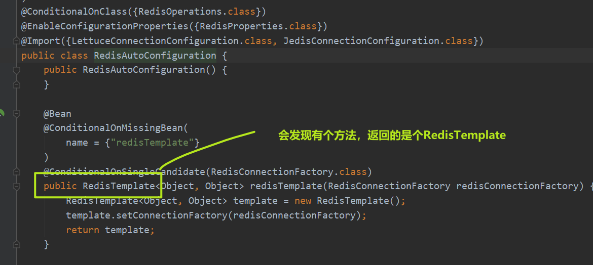 @ConditionalOnMissingBean注解指代一个条件,就是该方法是在特定条件下才会被调用,条件:当我们的spring工厂中没有redisTemplate这个对象的时候,才会调用该方法。最终才会返回一个RedisTemplate对象。