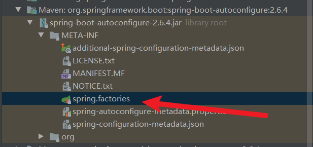 在我们查看该项目jar包管理目录中找到spring.factories(因为在springBoot项目执行的时候就会加载到此处)