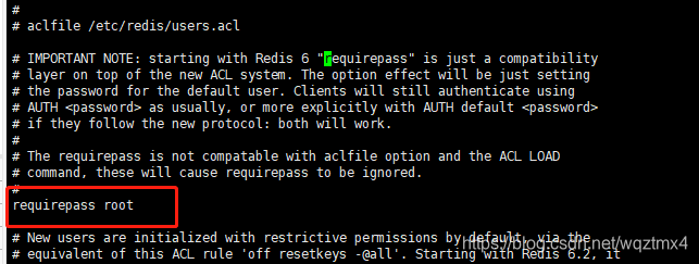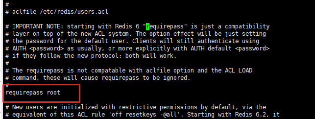 设置访问密码,requirepass后面跟的是密码,我的密码设置为root