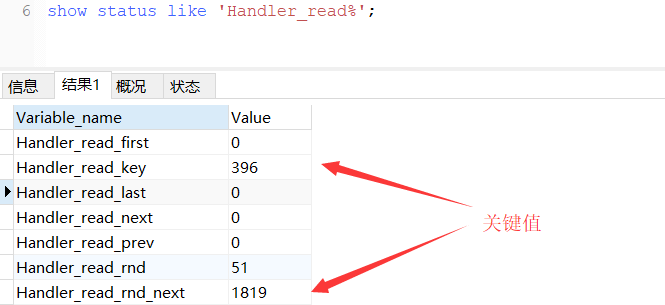 handler_read_key:这个值越高越好,越高表示使用索引查询到的次数
