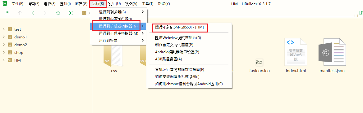 4.启动HBuildX,在最上方选择 运行---运行到手机或模拟器---Android模拟器端口