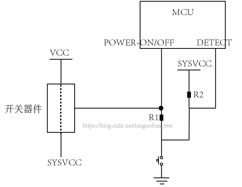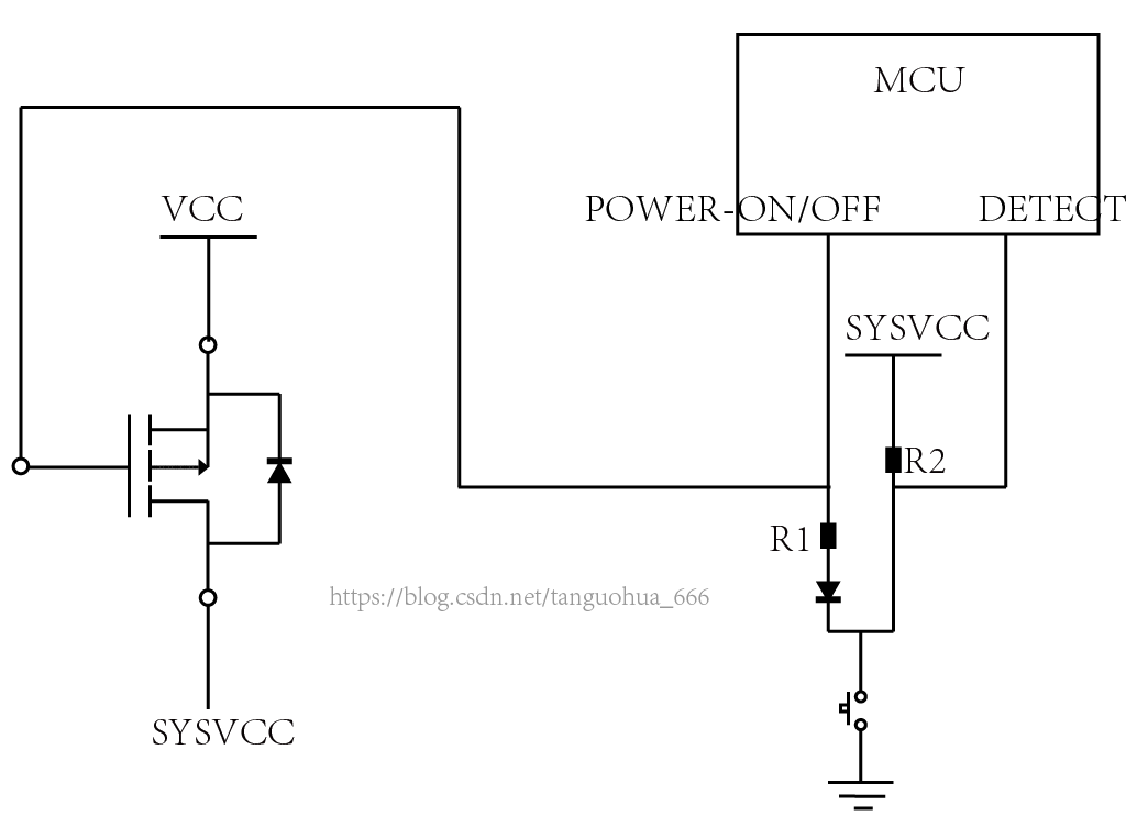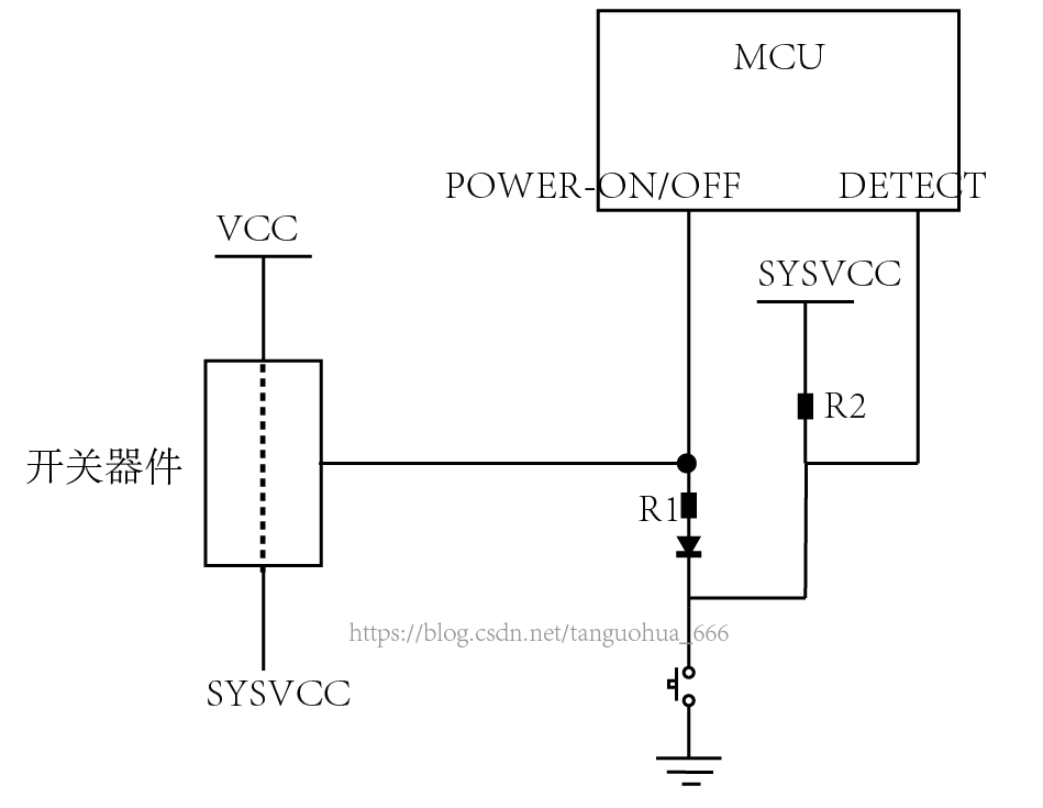 关机过程是这样子的:按键按下,此时DETECT脚检测到低电平(换句话说该脚正常情况下应该是检测到高电平),由于共用一个按键,因此这个高电平与POWER-ON/OFF脚似乎是直通的,这显然是不行的,所以要在左边加上二极管以阻止电流流入POWER-ON/OFF脚,MCU检测到DETECT脚为低电平且持续2秒钟后就会向POWER-ON/OFF脚输出高电平,此时开关器件关断,于是SYSVCC不再有电压。于是电路图演变为如下这个样子: