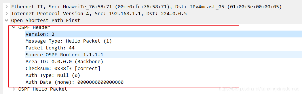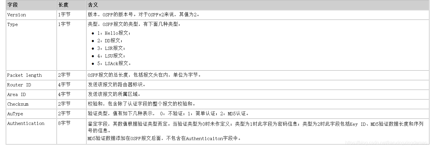 | Type | 1字节 | 类型,OSPF报文的类型,有下面几种类型: