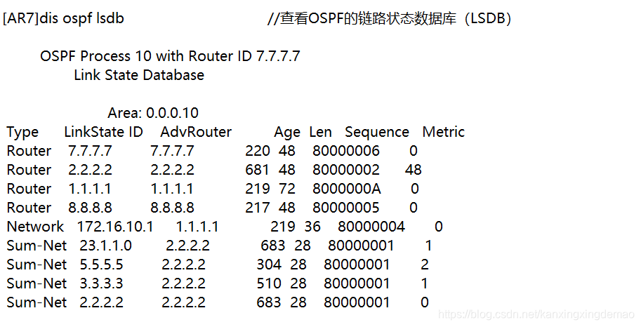 区域边界路由器(ABR)指连接多个区域的路由器,ABR为每一个所连接的区域维护一个LSDB,必须有一个端口物理或者逻辑(虚连接)连接到区域0