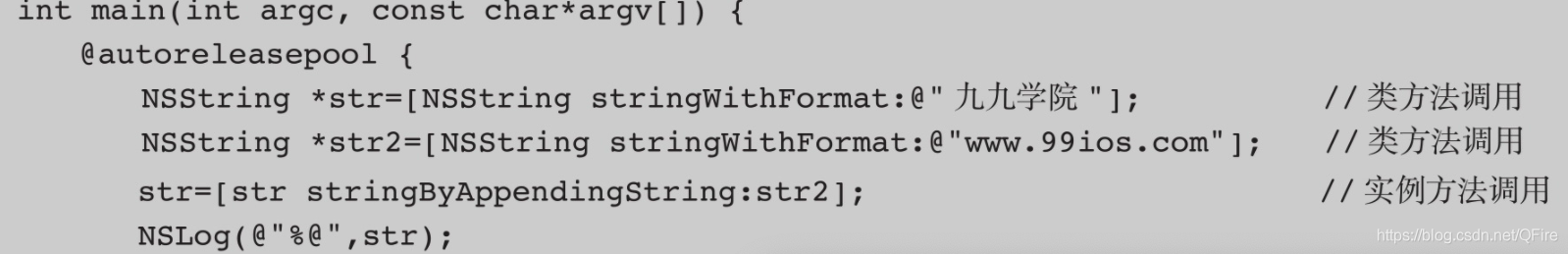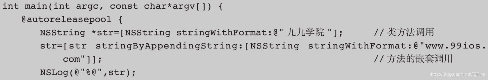 嵌套调用:有时为了避免声明大量的局部变量来存储临时结果,Objective-C也支持嵌套消息表达式。上面的案例中,可以不声明str2,从而对代码做如下改写: