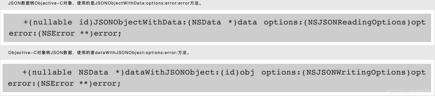 苹果官方提供了原生的解析JSON数据的方法——NSJSONSerialization。NSJSONSerialization类中提供了JSON与Objective-C对象之间相互转换的方法。