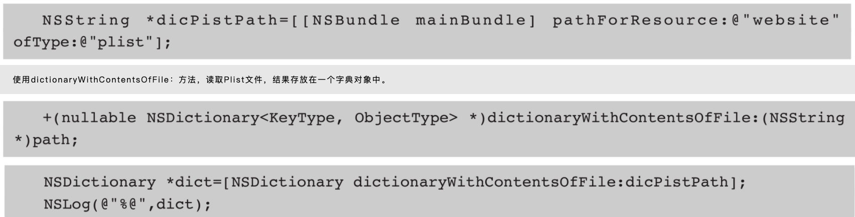 Plist文件的顶层结构通常是由一个字典或者一个数组构成的。因此,Plist文件的读取思路,就是把Plist文件中的所有数据一次性读取出来,然后放到一个字典对象或数组对象中,供后续操作使用。