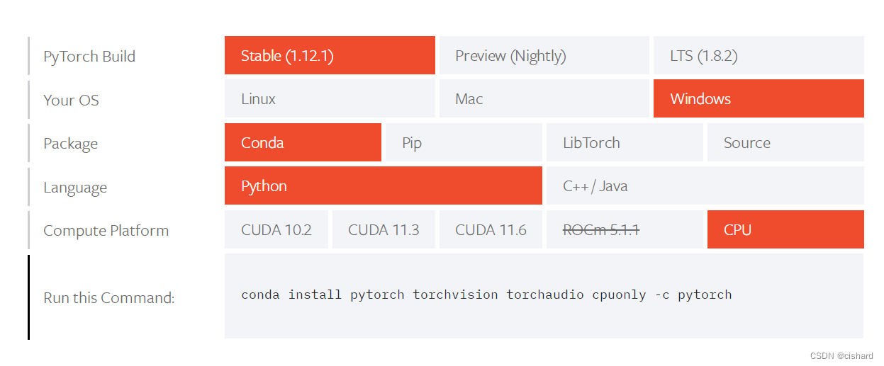 由于之前安装过miniconda,再加上笔记本电脑是核显,所以只安装了CPU版本的pytorch,安装过程很顺利,十分钟结束~进入网址---Get Started---Started Locally然后选择对应版本,在Anaconda的终端中激活环境,输入Run This Command中的命令,然后等待安装完成。(CPU的版本torch.cuda.is_available()返回False)