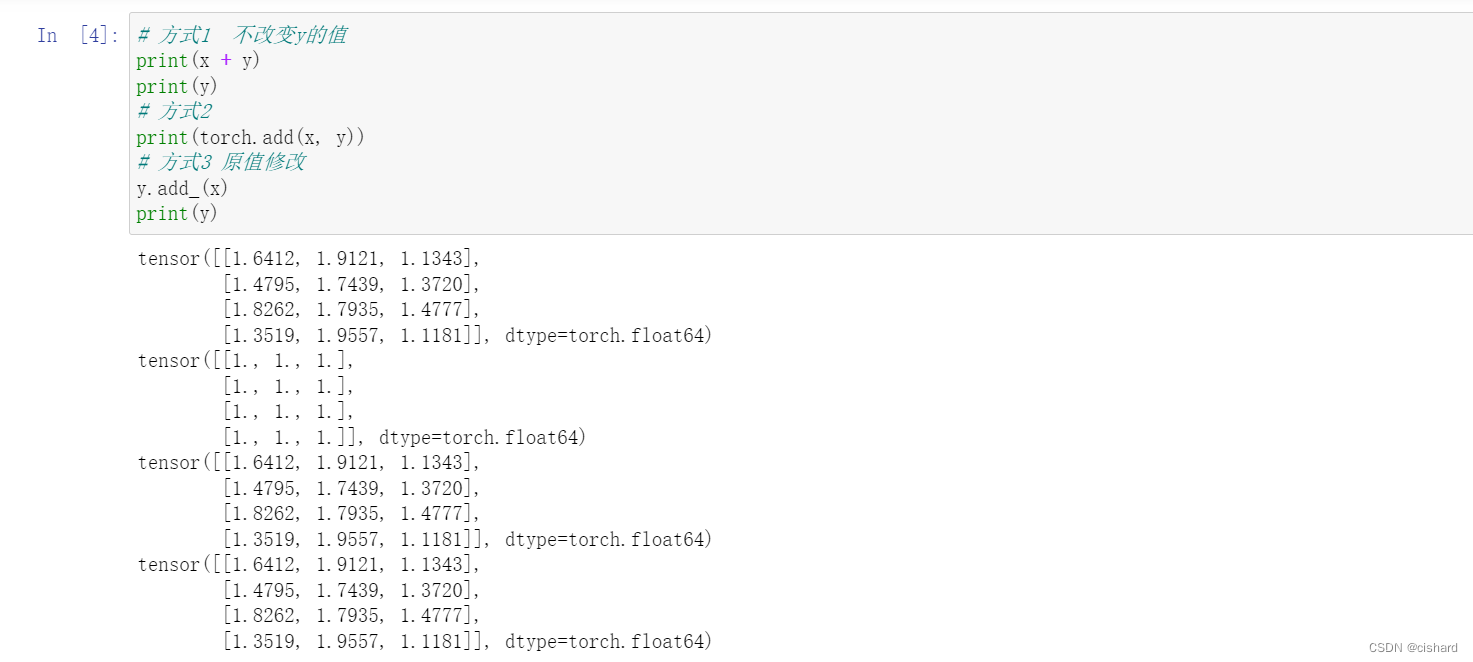 y= x.new_ones(4, 3, dtype=torch.double) #基于已经存在的x构造一个tensor y ,具有相同的torch.dtype和torch.device