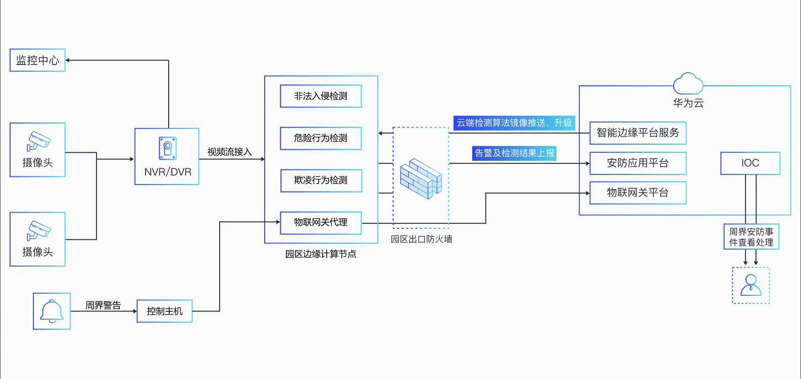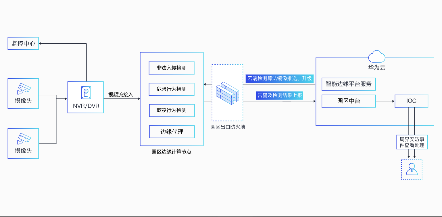 对校园重点区域实时监控,针对异常行为及事件识别及告警,事前主动预防、事中快速响应,事后精准协查,从而提高校园安保工作效率。