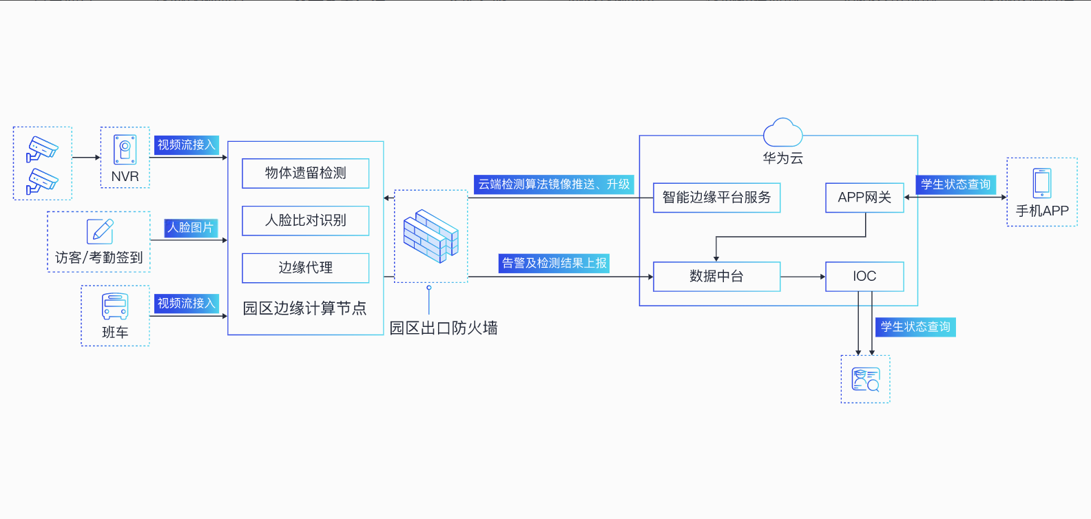 建立健全的接送交接制度,利用人脸识别、车牌识别等技术,针对接送家长身份确认以及学生签到签退,保证孩子安全,提高家长对校方的信任和信心。