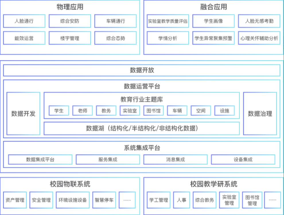 智慧校园逐步向校园环境数字化、教与学模式创新、信息系统互联互通演进。通过感知与互动反馈、智能化控制、智能化管理、数据智能分析和智能视窗等手段全面感知校园物理环境,实现“精细化管理、协同化支撑、个性化服务”的目标。