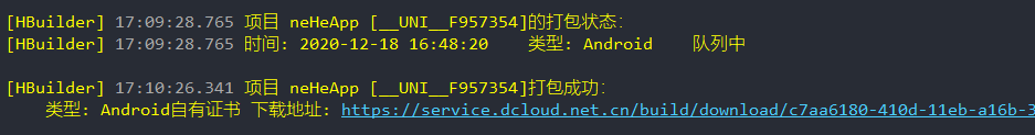 打包的时间可能会长一点,打包成功后,会在控制台打印出一个地址,将该地址用浏览器打开就可以下载打好的包了。