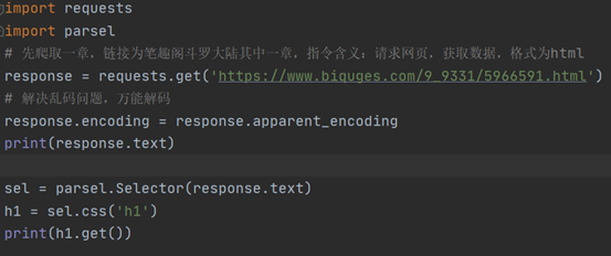 Pycharm中导入parsel包,进行解析并输出h1标签内容。