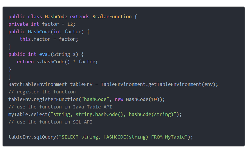tableEnv.sqlQuery("SELECT string, HASHCODE(string) FROM MyTable");