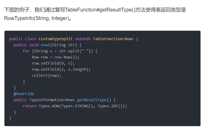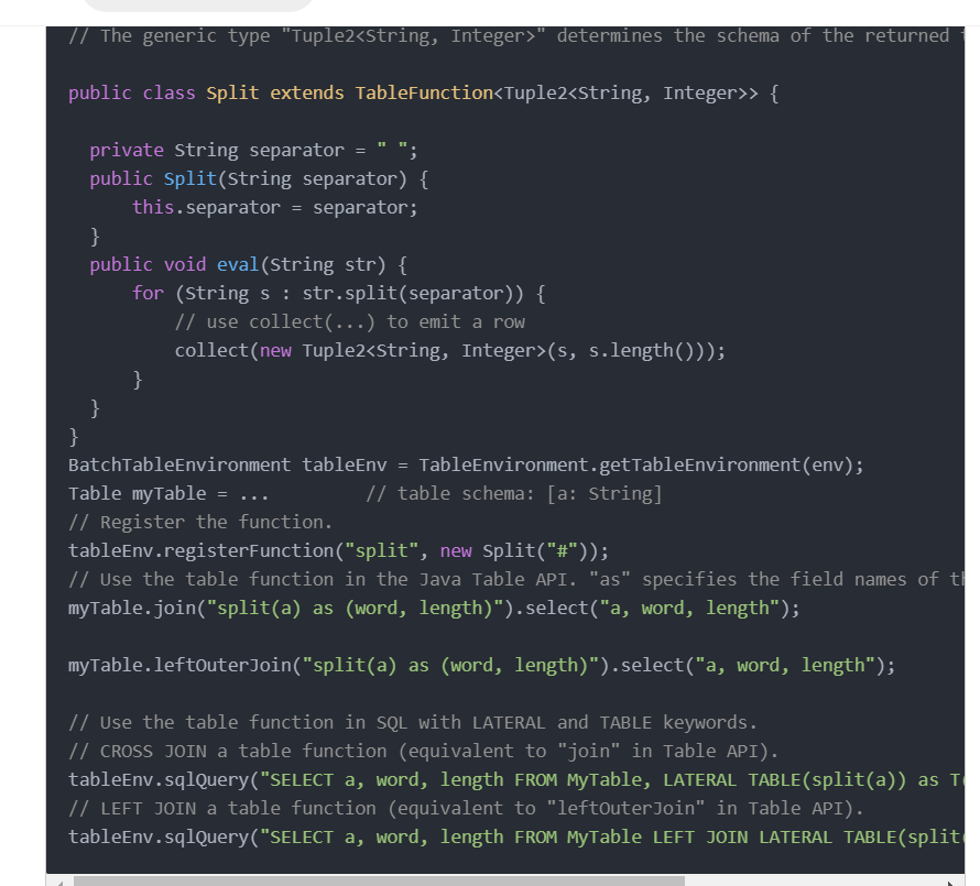 为了自定义表函数,需要继承TableFunction,实现一个或者多个evaluation方法。表函数的行为定义在这些evaluation方法内部,函数名为eval并且必须是public。