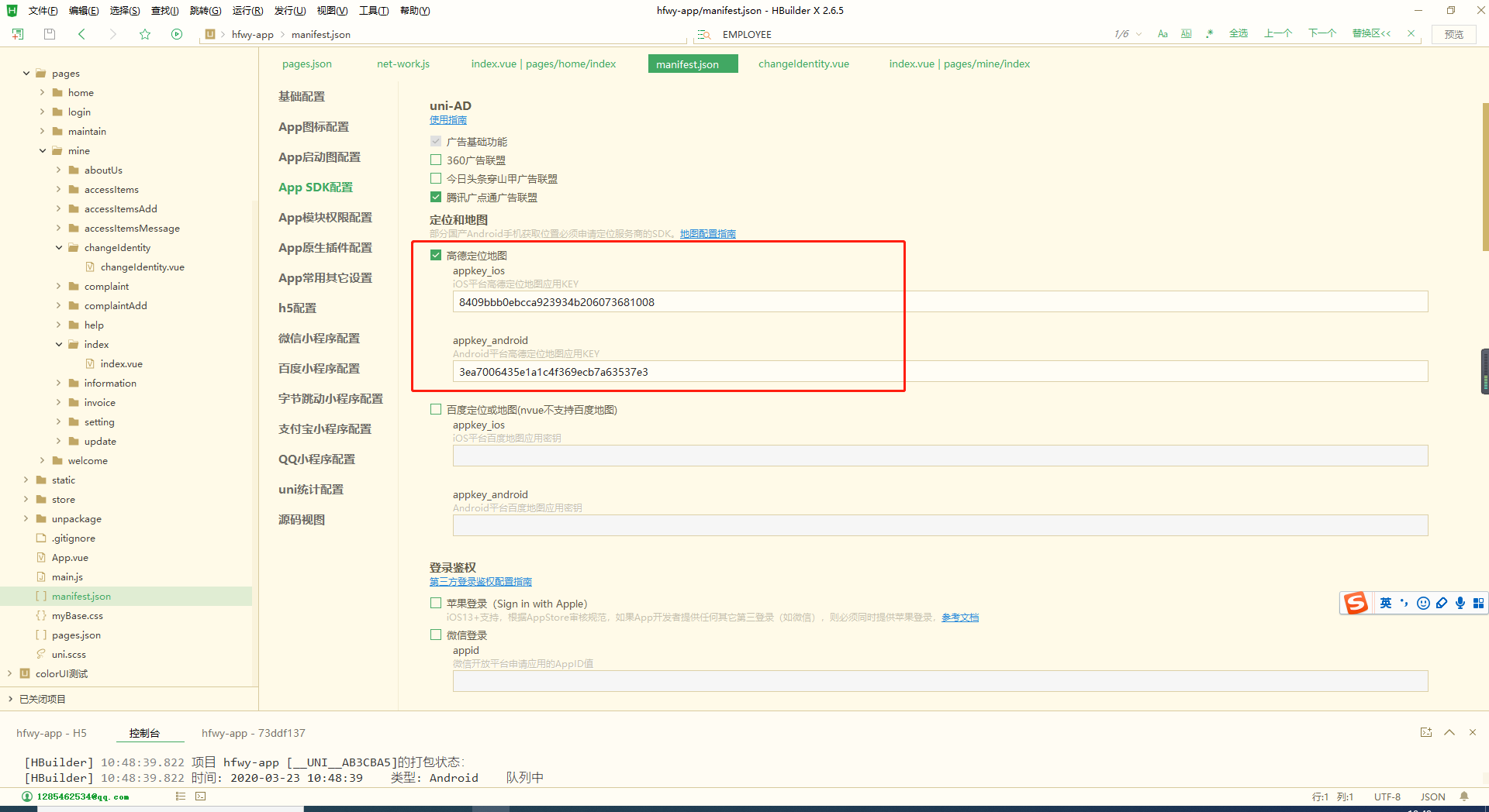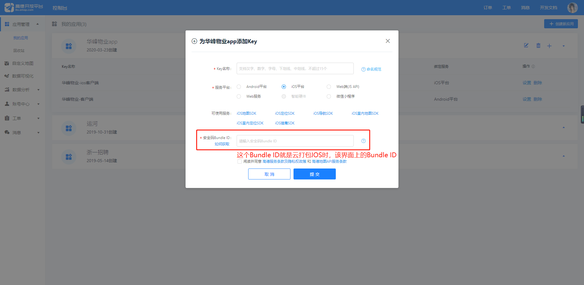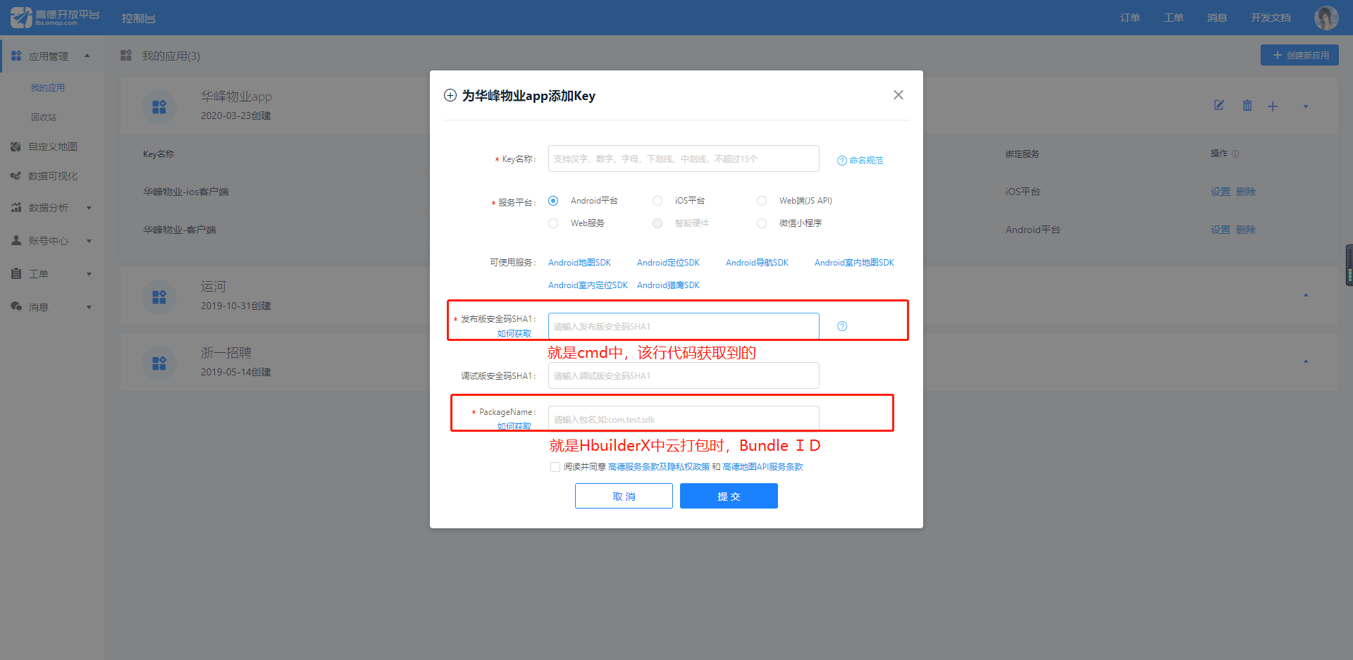 HBuilderX使用高德地图,获取当前定位1、配置高德地图key2、地图插件配置,该链接有高德地图和百度地图的配置方法 上链接中的知识,不在复述,补充一点关键资料 2-1、获取安卓key 结果如下: 2-2、生成IOS的key版权声明:本文为BetterGG原创文章,遵循CC 4.0 BY-SA版权协议,转载请附上原文出处链接和本声明。原文链接:https://blog.csdn.net/BetterGG/article/details/105043547