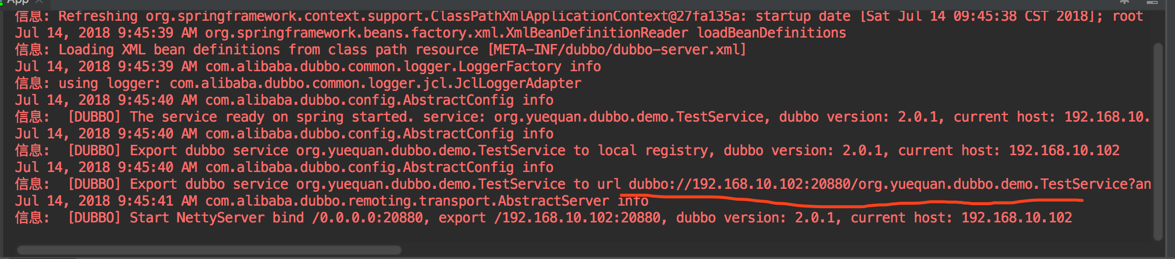 <dubbo:service interface="org.yuequan.dubbo.demo.TestService" ref="testService" protocol="dubbo" version="1.0.0" />